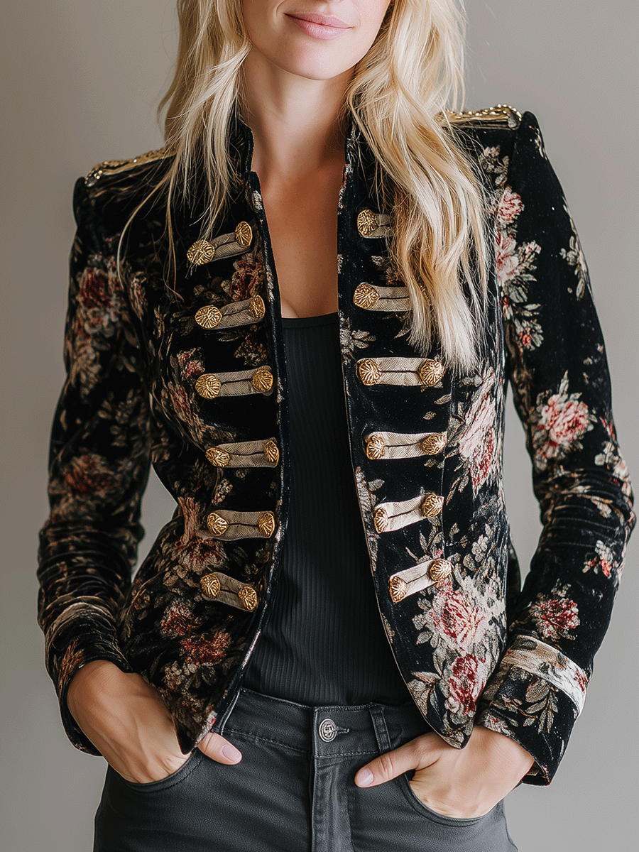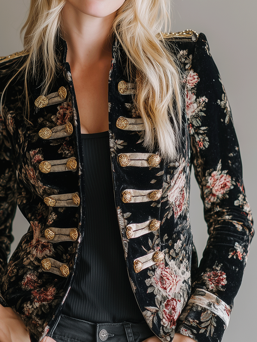 Vintage Floral Velvet Military-Inspired Blazer Jacket