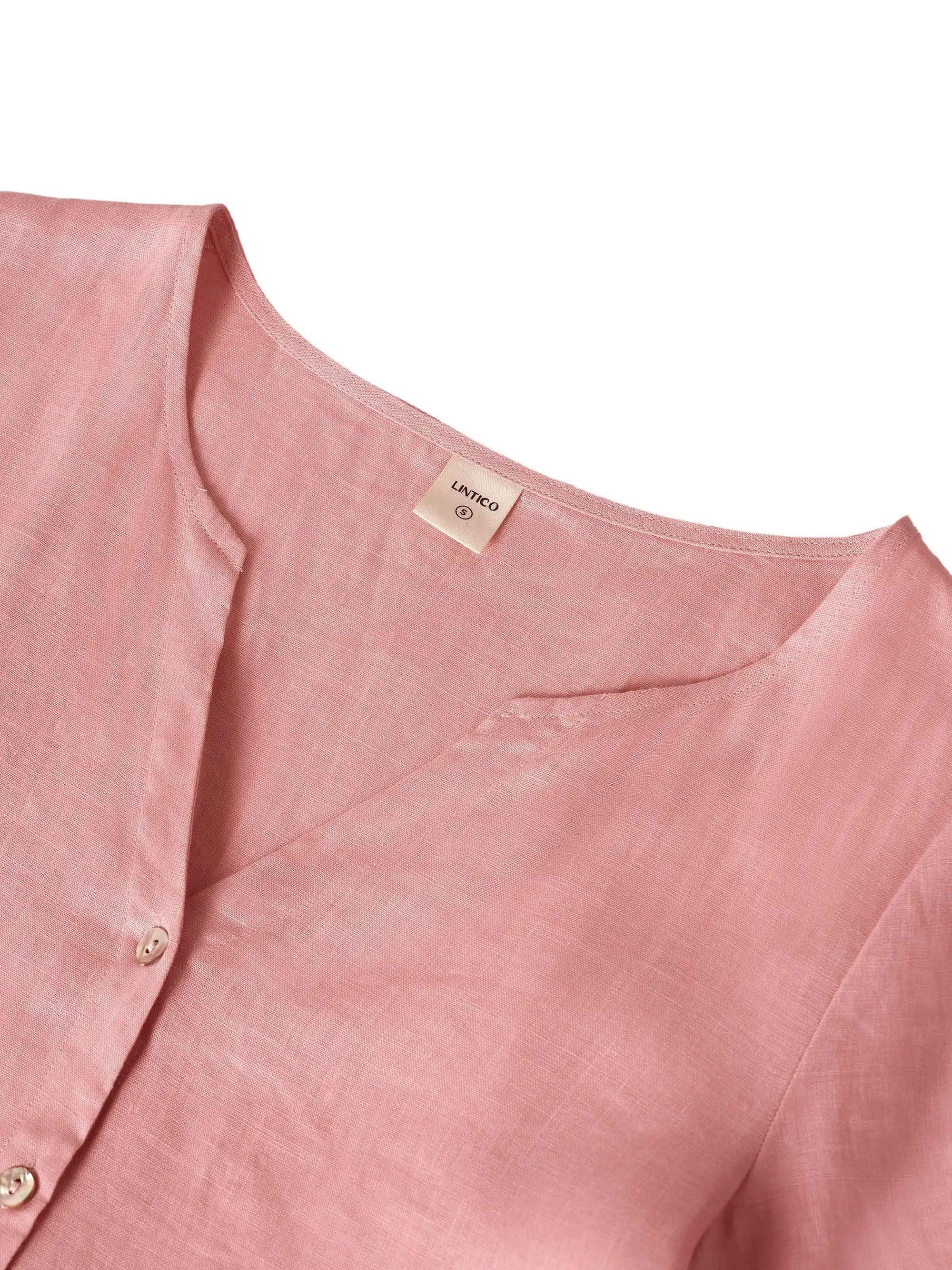 - V-neck design accented with handcrafted shell buttons.