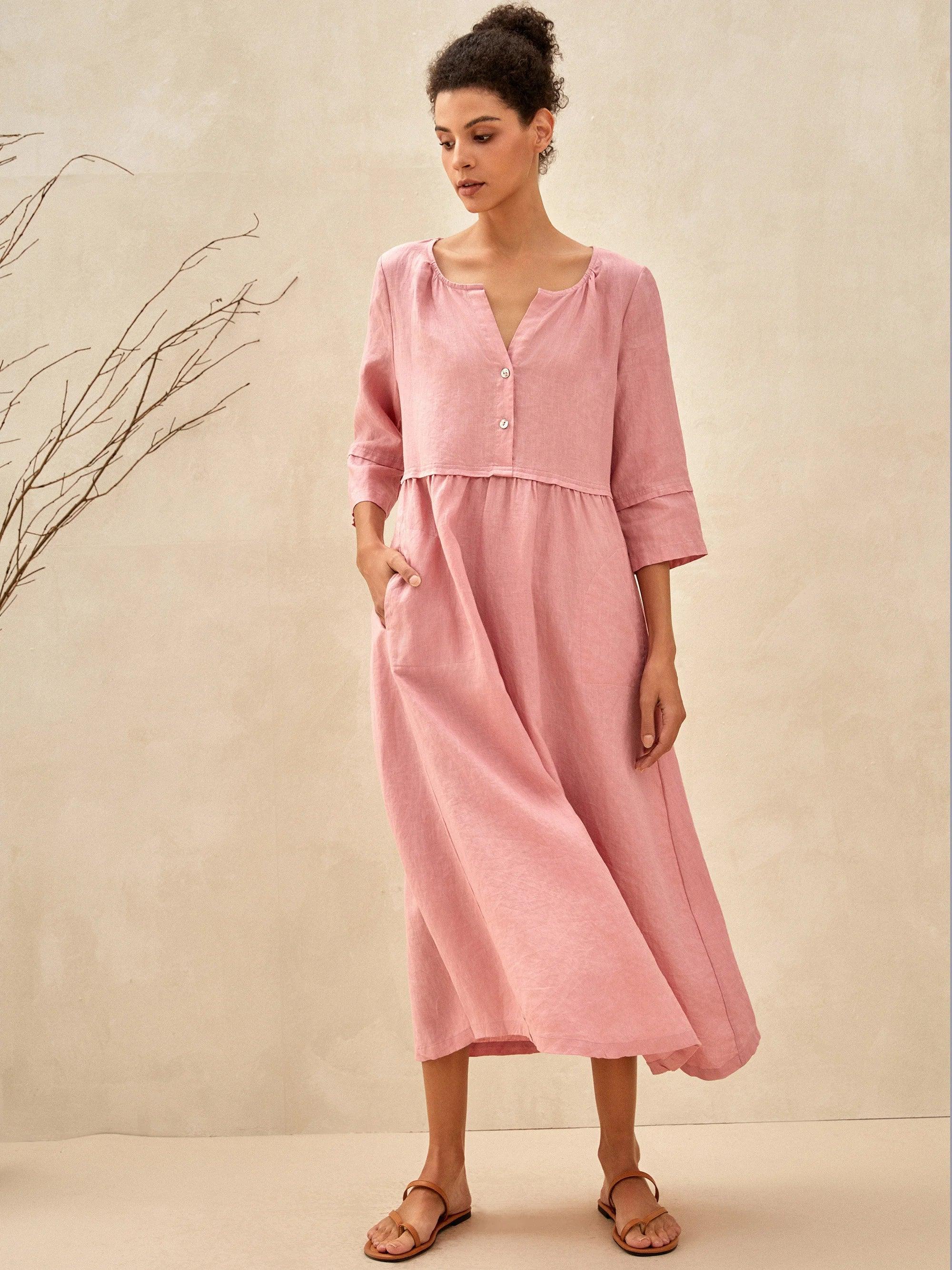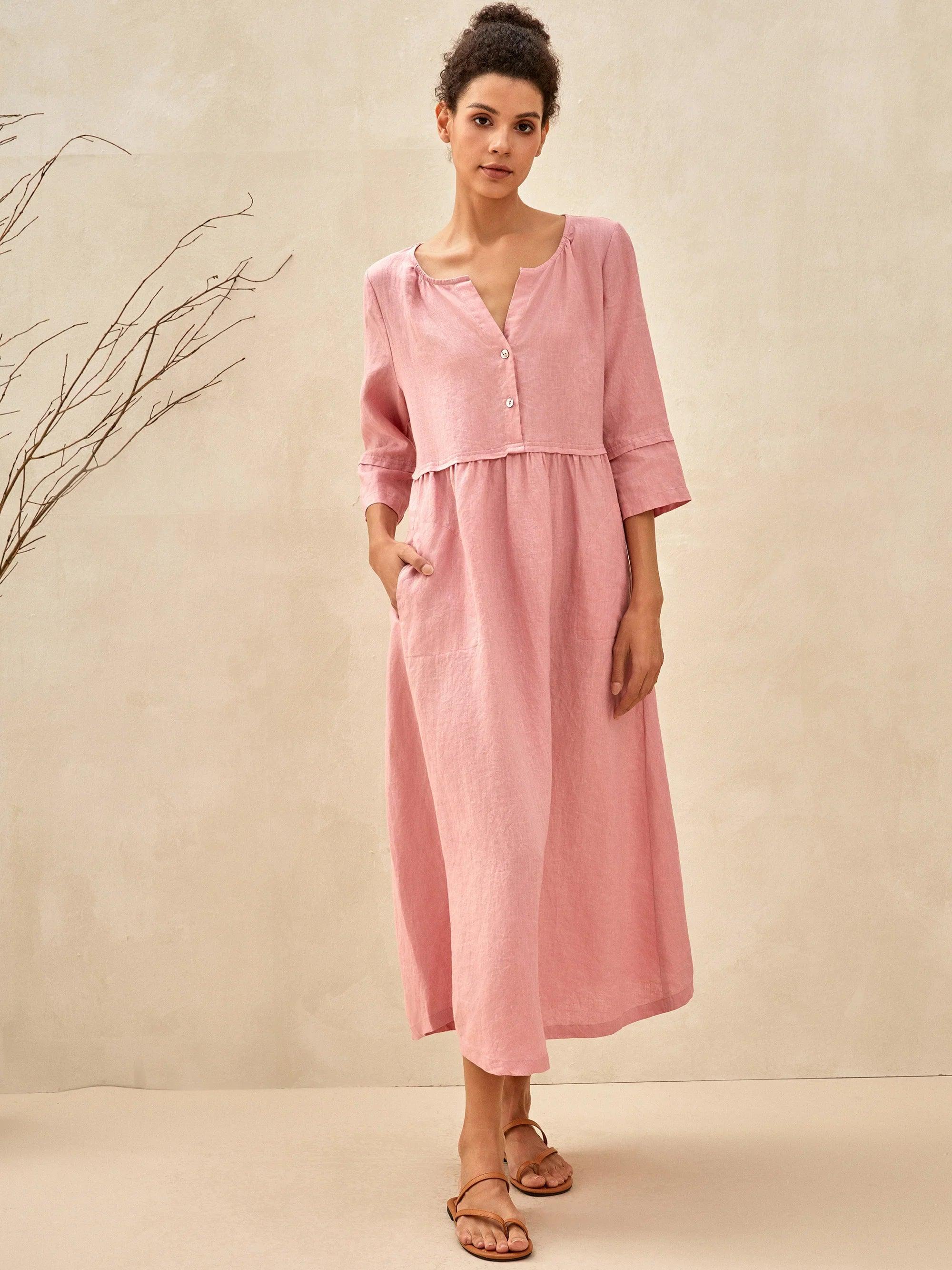 100% Linen Loose Fit Button Waist Gathered Maxi Dress LUNA