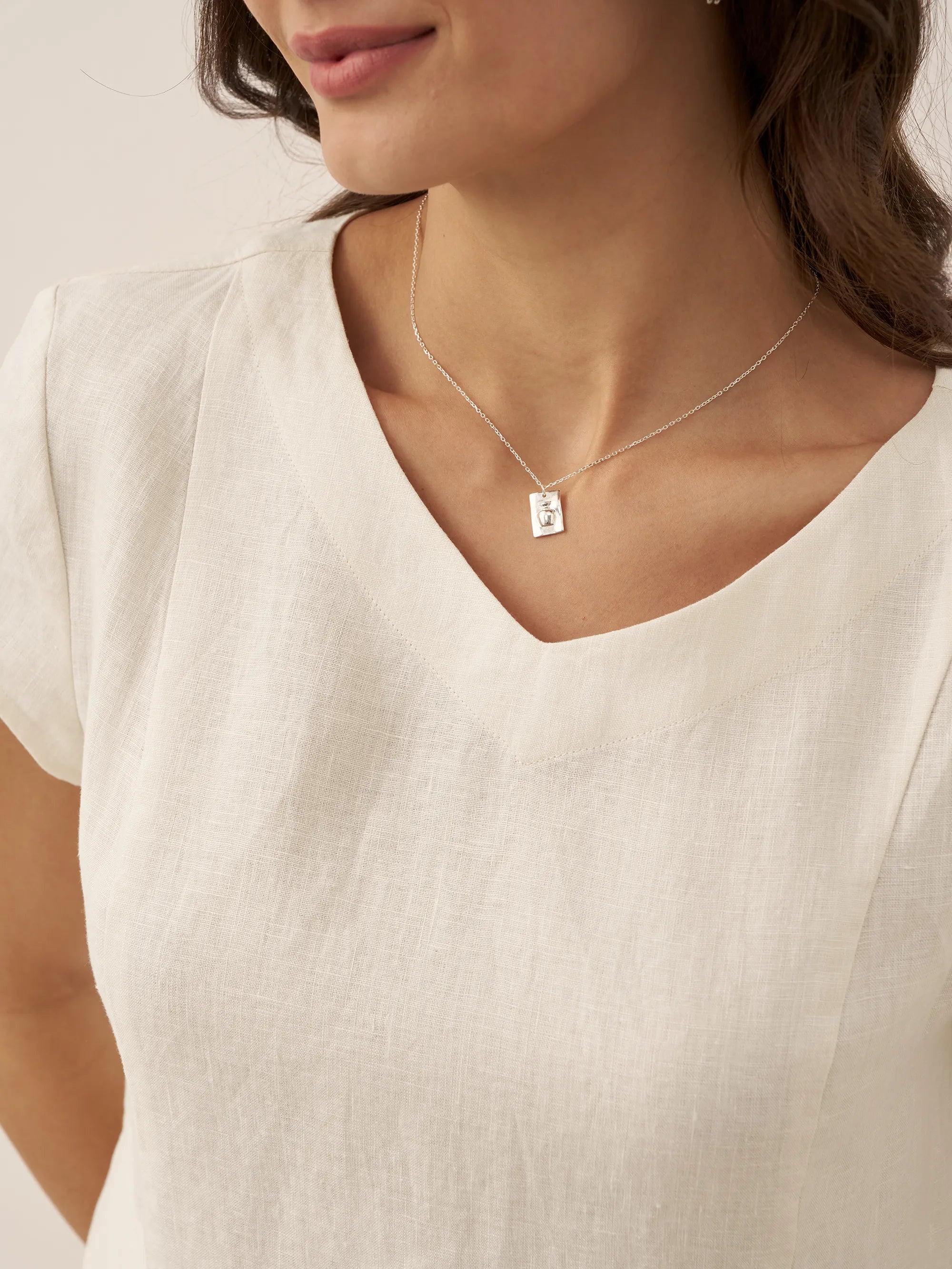 - Relaxed fit silhouette with V-neck design, enhancing neckline contours