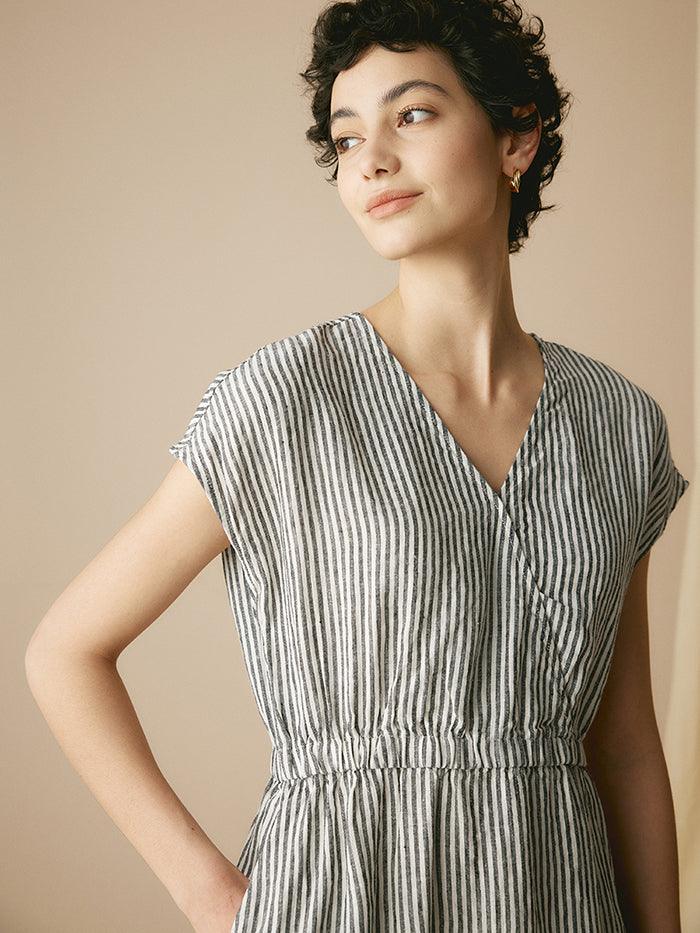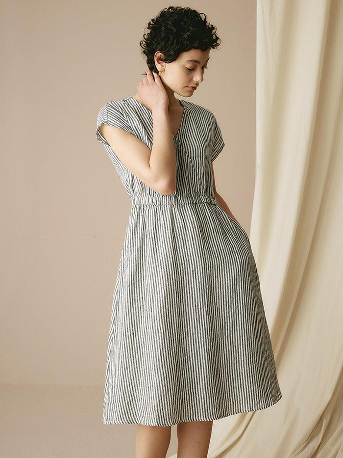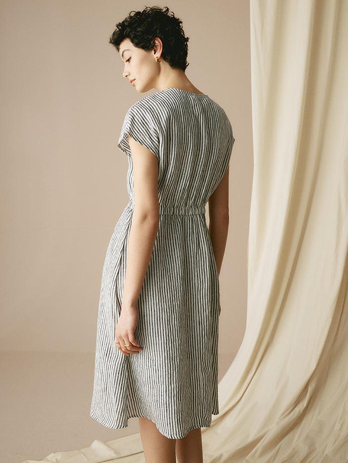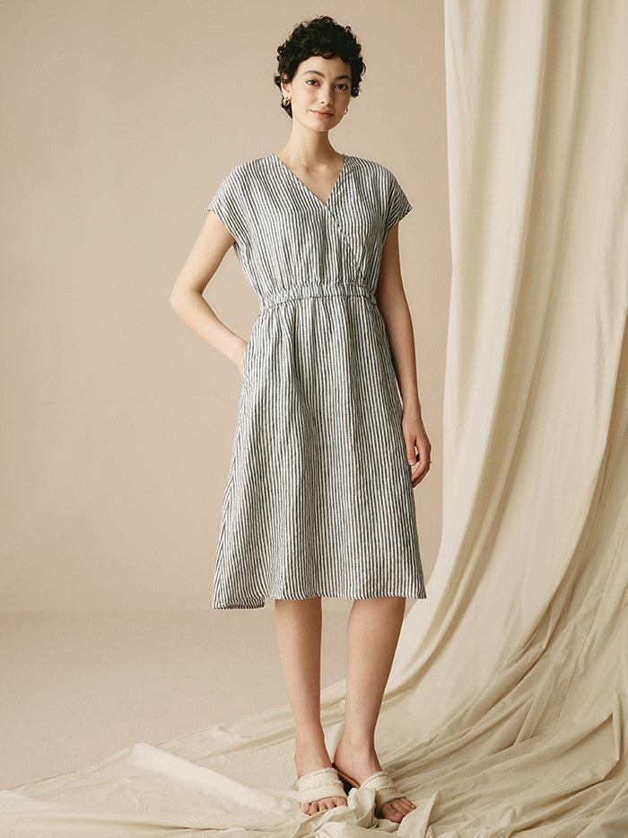 100% Linen Striped Elastic-Waist Midi Dress ARIA
