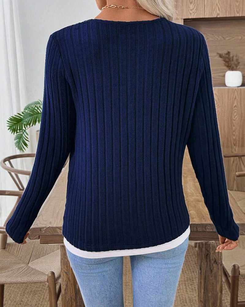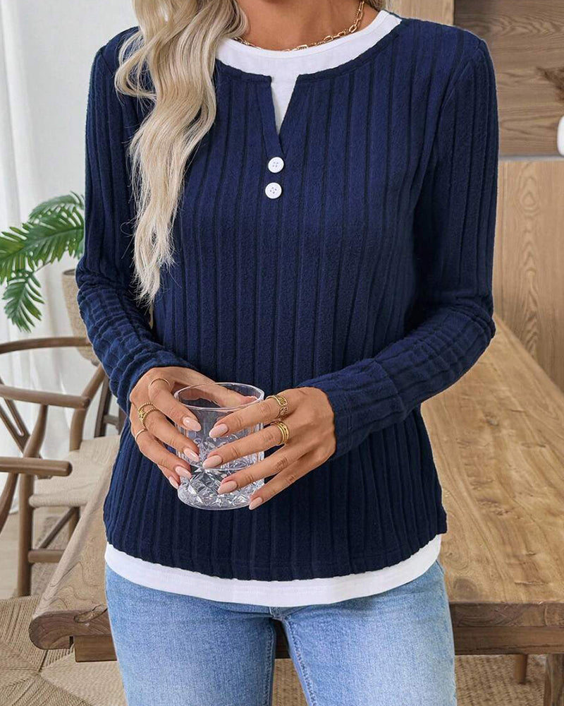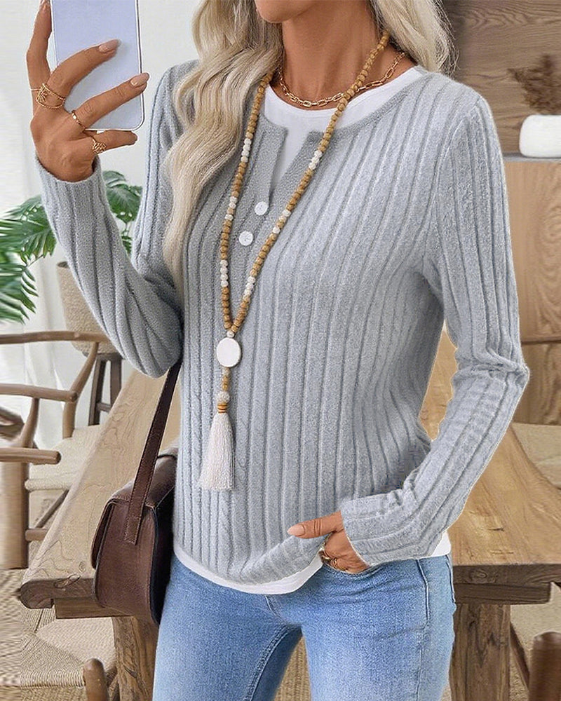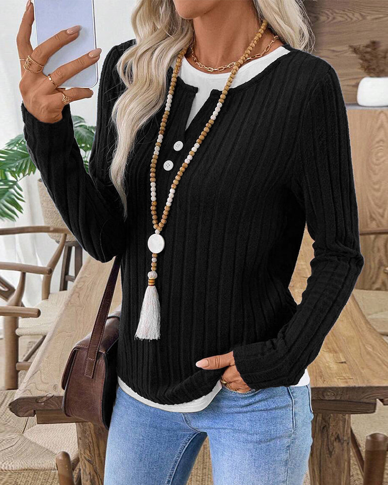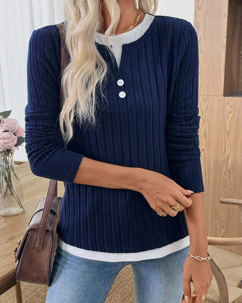 Casual Ribbed Knit Fake 2-Piece Henley Shirt