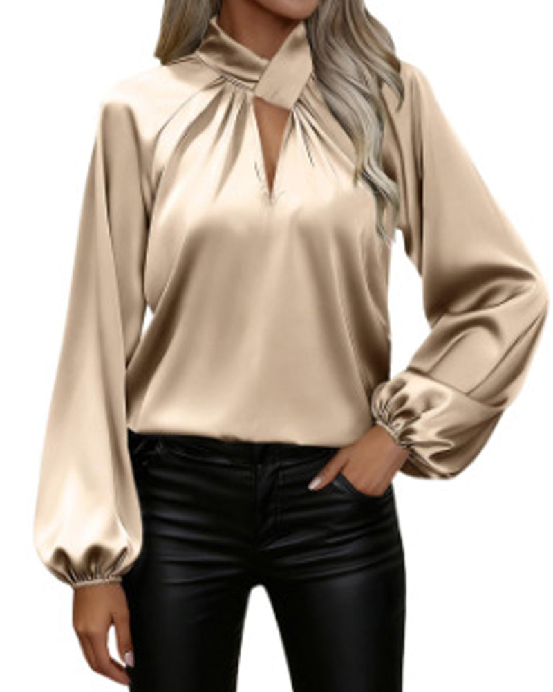 Soft satin fabric, lantern sleeves, stand cross collar features cutout design