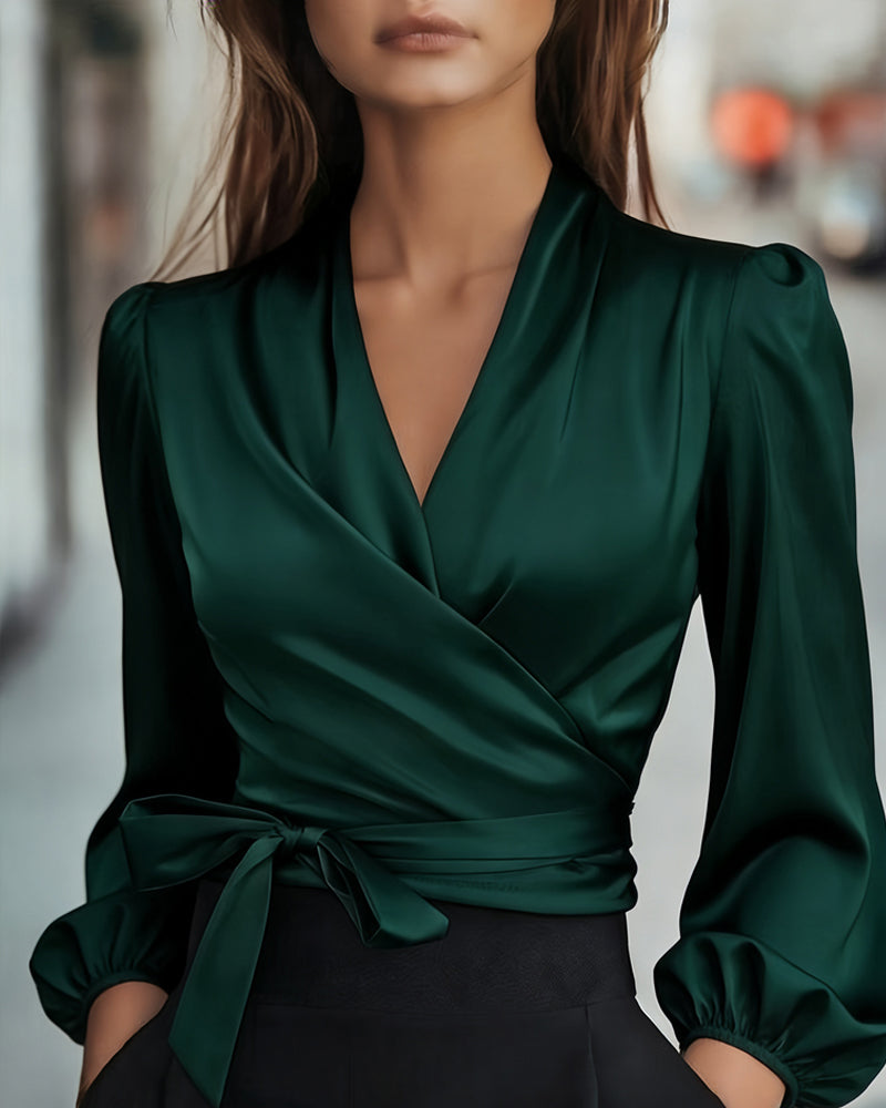 - Design: Puff sleeves, v-neck, surplice neck, waist tie design