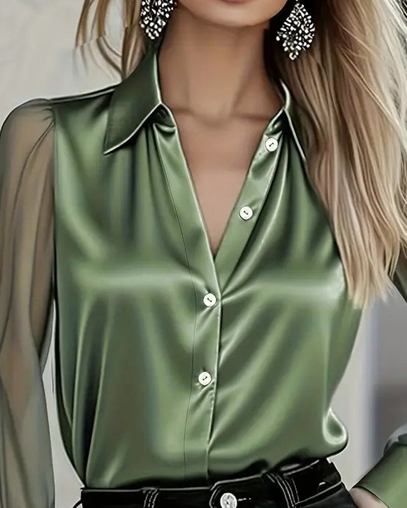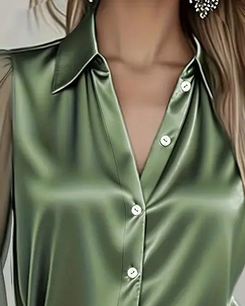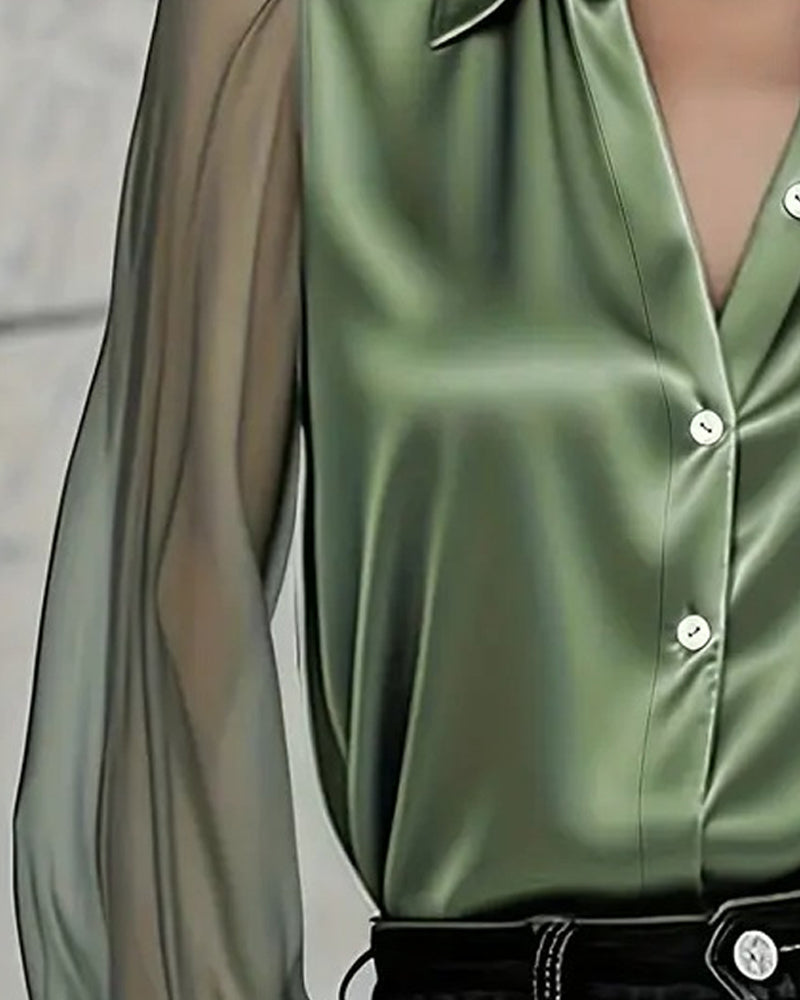 Luxury Sheer Sleeves Patchwork Silky Satin Blouse