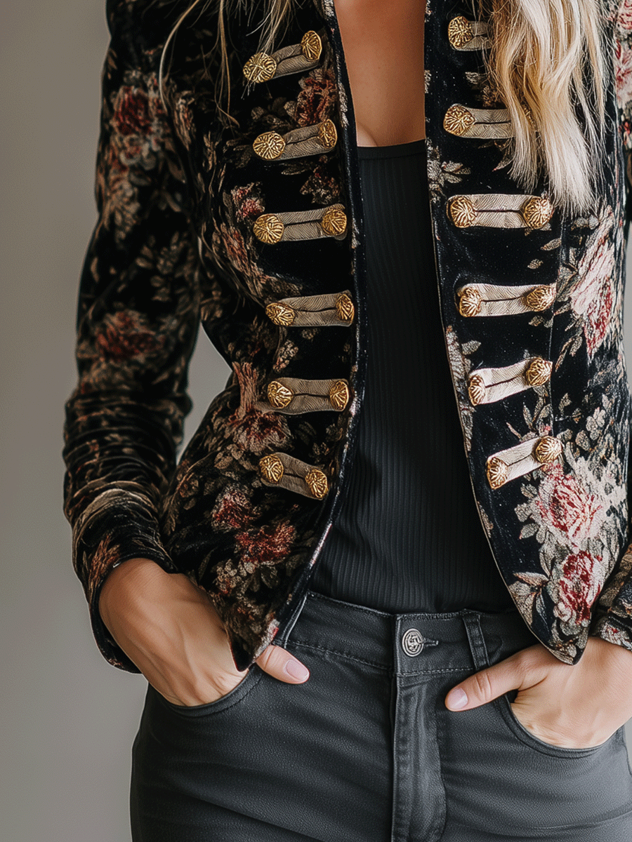 The Vintage Floral Velvet Military-Inspired Blazer Jacket is an exquisite choice for individuals looking to merge traditional military aesthetics with vintage charm. Its luxurious fabric and unique design make it a versatile piece suitable for various occasions, ensuring you stand out with elegance and flair wherever you go.